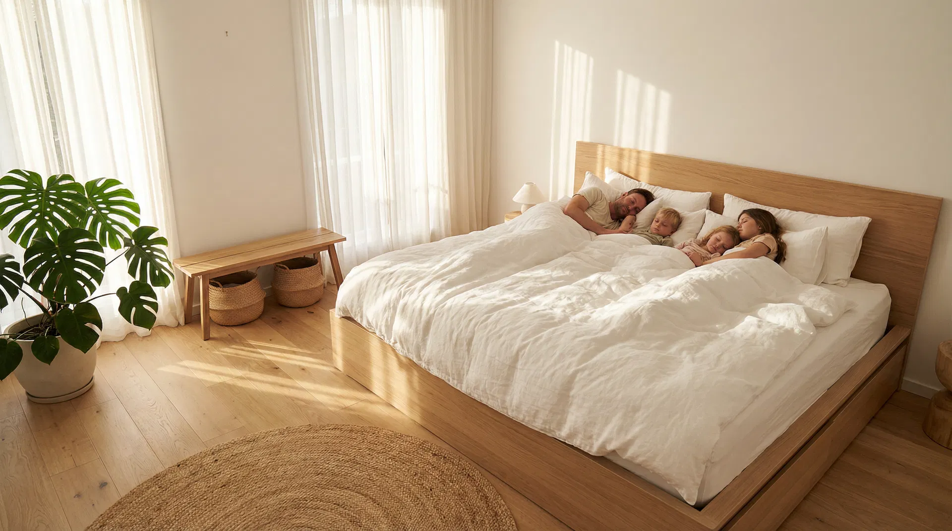 Het 300 cm familiebed (300×200 cm) is het grootste standaard Europese familiebed. Het bestaat meestal uit 3×100 cm of 4×75 cm matrassen en biedt een luxe slaapervaring.